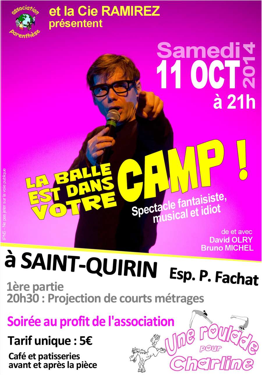 K’DJ (chariot disco), Vinyl Boosters (soul, funk), Les Bure Haleurs (folk irradié), Marco et les Ferailleurs (folk’abilly), L’accord de Raide (rock festif, ska), DJ P’ti Jo et Selecta Moz’aya - Samedi 11 Octobre 2014 : Soirée Théâtre à la Salle des Fêtes : La Balle est dans votre Camp (Cie Ramirez) au profit de l’association “Une roulade pour Charline“
