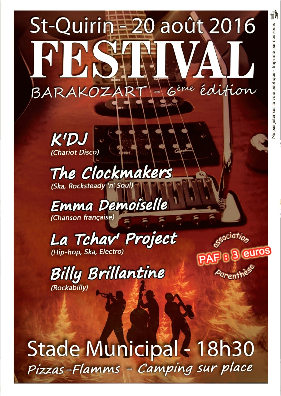 - Samedi 20 Aout 2016 : Festival BARAKOZART 6ème édition, avec à l’affiche :